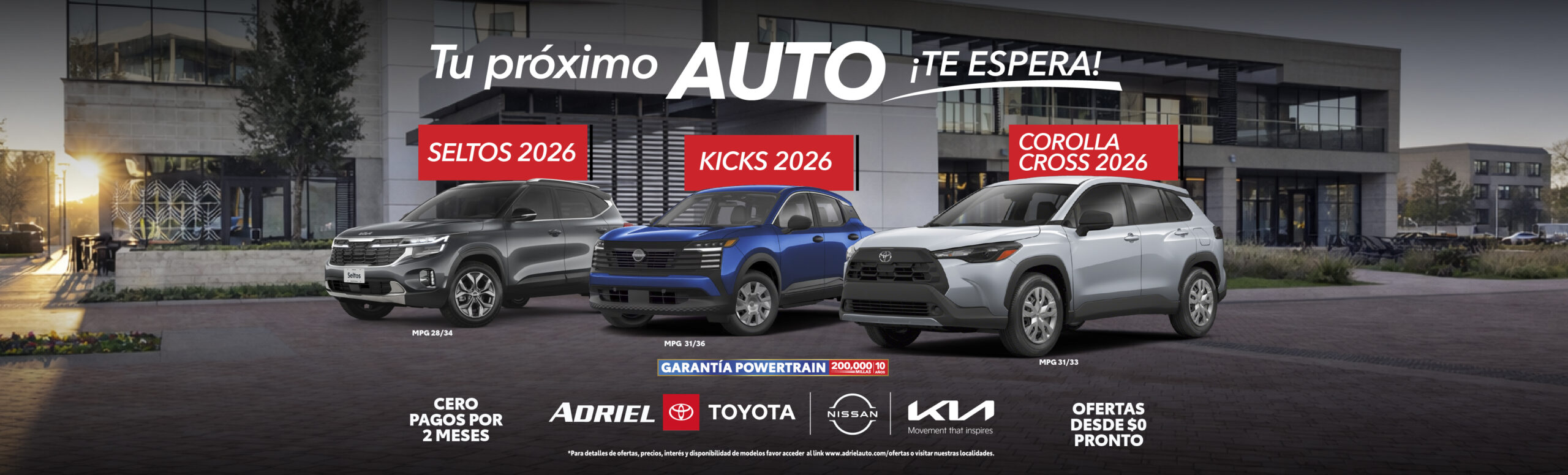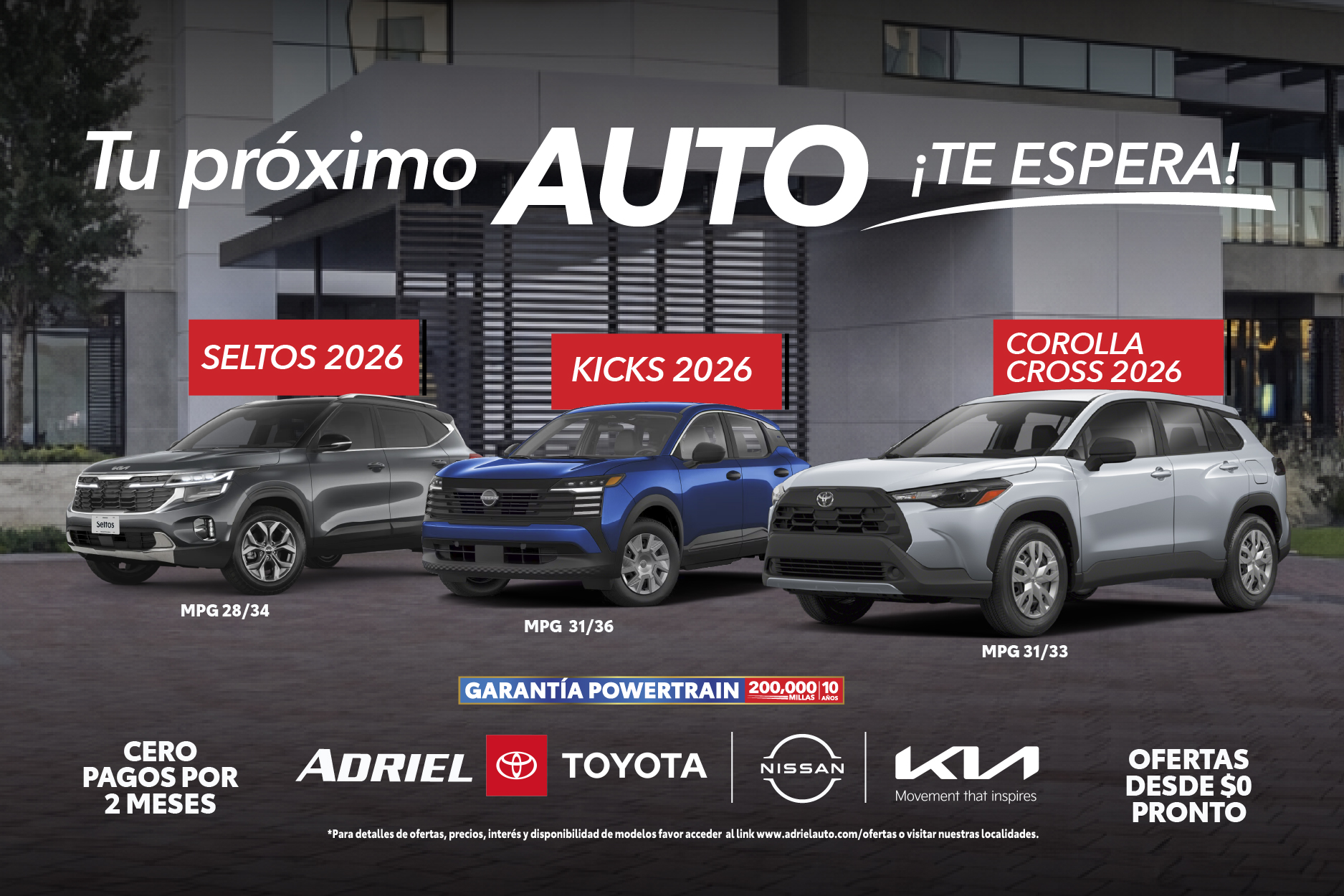 Garantía 200,000 millas/10 años en Motor, Caja de transmisión, Barra de transmisión, Caja de transferencia y Eje de impulsión. Powertrain Limited Warranty administered by Fidelity Warranty Services (FWS), insured by Courtesy Insurance Company, (A rated insurer), en vehículos Nissan no aplica a GT-R, LEAF ni a NV Comerciales, más detalles en el dealer. OFERTA DE $0 PAGOS HASTA MAYO 2026 - aplica a clientes que firmen entre el 26 de marzo al 4 de abril del 2026. Ofertas desde $0 pronto disponible, si cualifica. Ciertas restricciones y condiciones aplican. Más detalles en los dealers. Sujeto a aprobación de crédito. Las ofertas no incluyen seguro, registro, tablilla ni ACAA. Las ofertas no pueden ser combinadas con otras ofertas. Ofertas válidas del 1 al 31 de marzo de 2026 ó mientras duren las unidades.